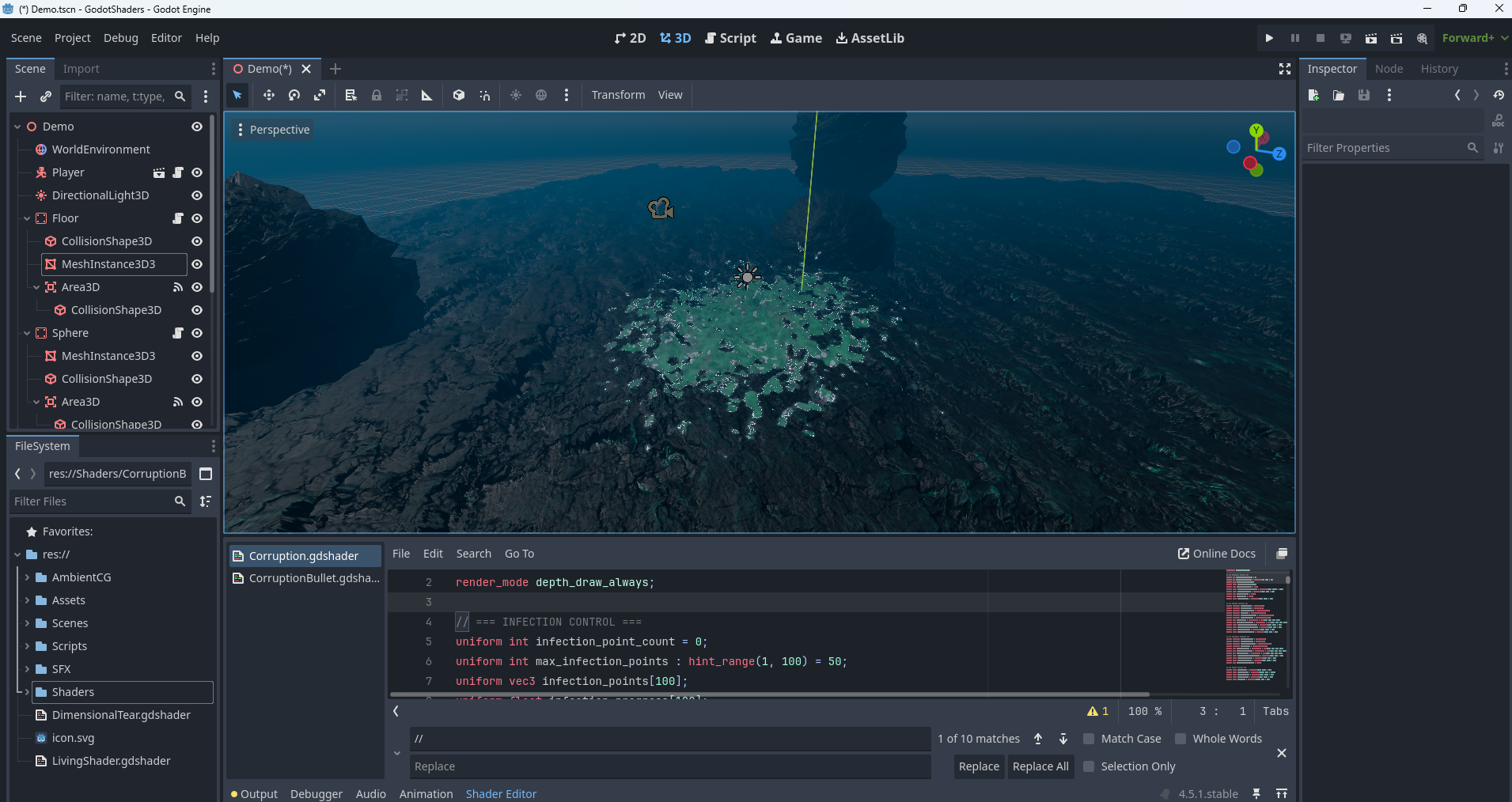 A complete shader system that lets you shoot projectiles to infect surfaces. Infection spreads organically from impact points with glowing veins, pulsing animation, and realistic merging.